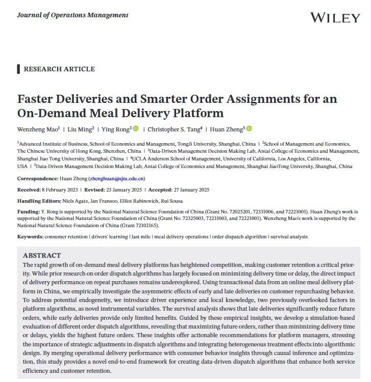 As instant delivery platforms evolve and market competition grows fiercer, customer retention has become a critical driver of sustainable business success. Addressing this challenge, Associate Professor MAO Wen Zheng from the Institute for Advanced Management Studies at Tongji University School of Economics and Management (SEM) co-authored a pioneering study titled “Faster Deliveries and Smarter Order Assignments for an On-Demand Meal Delivery Platform,” published in the Journal of Operations Management (JOM), the premier international journal in operations management.