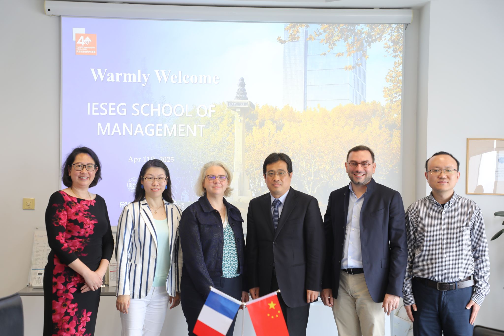 On the morning of April 11th, a delegation from IESEG School of Management visited our school. The delegation included Prof. Caroline Roussel (Dean), Mr. Marc Porto (International Relations Manager), and Ms. Yinghui Zhang (Project Manager of the East Asia Office). They were warmly welcomed by Prof. Liang Jian (Deputy Dean of SEM) and Ms. Shou Yuexian (Director of the Public Relations and Communication Center and Deputy Director of the EMBA/MBA Programs Center).