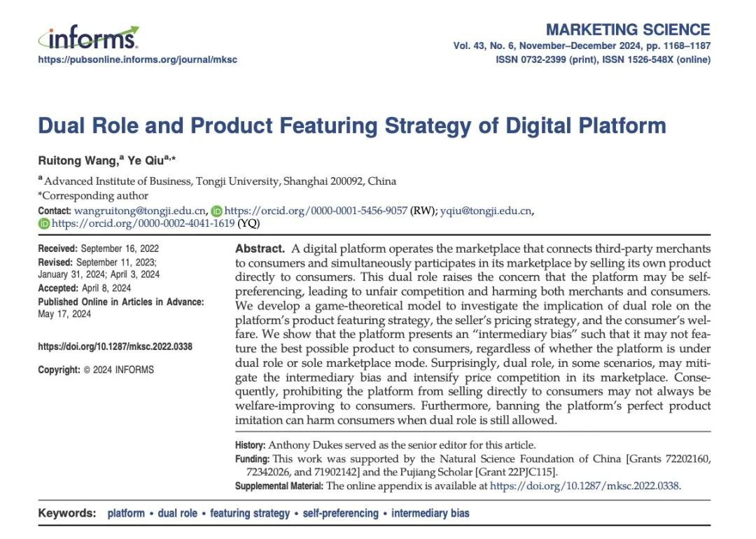 A digital platform connects third-party merchants and consumers within a marketplace. It also sells its own products to consumers and takes part in marketplace transactions. Does this dual role lead to unfairness, harming the interests of merchants and consumers? To address this question, Associate Professors WANG Ruitong and QIU Ye of the Advanced Institute of Business at Tongji University conducted in-depth research and, as the first and corresponding authors respectively, published a joint paper entitled “Dual Role and Product Featuring Strategy of Digital Platforms” in Marketing Science, a top marketing journal.