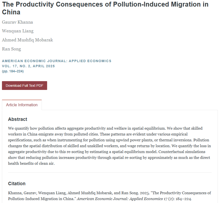 Environmental pollution and population mobility are two important factors that affect economic growth in China. Through what mechanism does environmental pollution change the spatial mobility of the population, which in turn has an impact on economic development? To address this issue, LIANG Wenquan, Associate Professor of the Department of Public Administration, and Ahmed Mushfiq Mobarak, Professor of Yale University, Gaurav Khanna, Associate Professor of the University of California, San Diego, and Ran Song, Assistant Professor of the National University of Singapore have conducted a research and published a joint paper “The Productivity Consequences of Population Mobility” in the prestigious international journal “American Economic Journal: Applied Economics”.