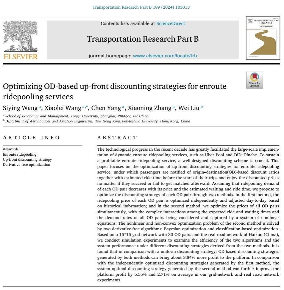 In response to this issue, Professor WANG Xiaolei’s research team from the Department of Management Science and Engineering has conducted a research into differentiated pricing for dynamic ridepooling services. Their seminal paper, “Optimizing OD-based up-front discounting strategies for enroute ridepooling services”, which was formally published in the prestigious journal Transportation Research Part B: Methodological, establishes a novel framework for operational optimization. Doctoral candidate WANG Siying of Tongji SEM is the first author, and PROFESSOR Wang is the corresponding author.
